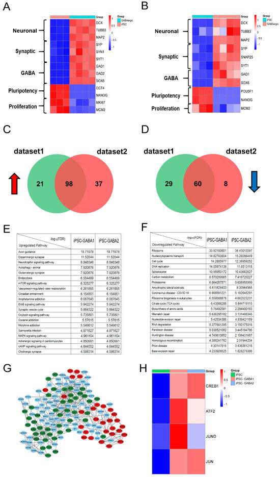 Identification of key pathways and regulators in GABAergic neural differentiation. The RNA-seq datasets (iPSCs versus iPSC-derived GABAergic neuron cells) were collected from the GEO database (GSE115565) and then the gene files were standardized to perform KEGG (ClusterProfiler, Version 3.8.1) and PPI analysis (STRING http://string-db.org/). (A) The heatmap of GABAergic neuronal marker genes in dataset 1(GSM3182508-GSM3182511). (B) The heatmap of GABAergic neuronal markers in dataset 2(GSM3182512-GSM3182515). (C) Venn diagram of 98 overlapping upregulated signaling pathways in both RNA-seq datasets, 21 unique upregulated pathways in dataset1 and 37 unique upregulated pathways in dataset 2 (p < 0.05). (D) Venn diagram of 60 overlapping downregulated signaling pathways in both RNA-seq datasets, 29 unique downregulated pathways in dataset1 and 8 unique downregulated pathways in dataset 2 (p < 0.05). (E) The top 20 upregulated pathways with lowest FDR shared between two RNA-seq datasets. (F) The top 20 downregulated pathways with lowest FDR shared between two RNA-seq datasets. (G) Protein–protein interaction of DEGs (FDR < 0.05) involved in MAPK (blue points), mTOR (red points), and cAMP pathways (green points) in iPSC-derived GABAergic neuron cells. (H) The heatmap of CREB1 and three other related TFs (ATF2, JUND, and JUN) in iPSCs and iPSC-derived GABAergic neuron cells.