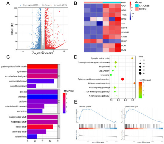 CREB1 induces GABAergic neuronal expression at the transcriptional level. GABAergic neuron cells of 7 days induced by CREB1 were carried on RNA-seq. (A) Results of DEGs (FDR < 0.05) are displayed in a volcano plot. (B) Heatmap of TFs involved in GABAergic neural development (Dlx1, Dlx2, Sox6), GABAergic neuronal markers (GAD1, Tubb3, Map2, Syp, Syap1, Syngr3, Syt11), and cell proliferation (Mki67). (C) All 4,665 DEGs were classified into one or more of the following three groups: biological processes (BPs), cellular components (CCs), and molecular functions (MFs). Significantly enriched GO terms are presented. (D) Upregulated DEGs and downregulated DEGs were analyzed separately using KEGG enrichment analysis. The top five upregulated or downregulated pathways (FDR < 0.05) are presented. (E) A total of 29,541 with abundance value of >1 FPKM were analyzed using gene set enrichment analysis (GSEA). The significantly enriched signaling pathways are presented.