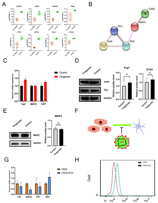 Inhibition of Notch signaling promoted GABAergic neural differentiation. (A) The FPKM of genes involved in the Notch pathway from RNA-seq including Notch1, Lfng, Notch3, Rbpj, Dtx1, Dtx3, Dll1, and Dtx4. (B) PPI network analysis of Notch1 and other TFs related to GABAergic neural differentiation (Dlx1, Dlx2, and Sox6). (C) RNA expression of Tuj1, Map2, and Syp in hMSCs after 7 days of treatment with or w/o tangeretin. (D,E) A Western blot image showing the expression of Tuj1, Map2, and Syn1 with or without the treatment of tangeretin and quantitative analysis. (F) Schematic pattern showing the inhibition of neural differentiation induced by CREB1 after overexpressing NICD. (G) The RNA expression of Tuj1, Gap43, Syp, and Ki67 of hUC−MSCs at 7 days after transfection with CA-CREB lentivirus and GFP (as a control) or NICD lentivirus. (H) Flow cytometry analysis of Tuj1 in hUC-MSCs at 7 days after transfection with CA-CREB lentivirus and GFP (as a control) or NICD lentivirus. Data are presented as mean ± SEM. Results were analyzed using t-test. Statistical significance: ns p > 0.05 * p < 0.05.