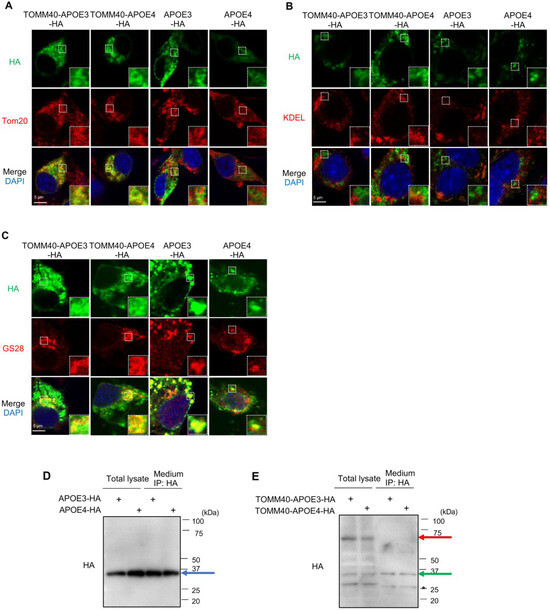 Neuro2a cells were transfected with one of the following vectors: APOE3-HA, APOE4-HA, TOMM40-APOE3-HA, or TOMM40-APOE4-HA. Four hours after transfection, the culture medium was replaced with a medium containing 2% fetal bovine serum (FBS) and 10 µM retinoic acid to induce neuronal differentiation. Then, 28 h after transfection, cells were fixed with 4% paraformaldehyde for 10 min and then permeabilized using 0.5% Triton X-100 (for mitochondria and endoplasmic reticulum) or 50 μg/mL Digitonin (for Golgi apparatus) for 5 min. Subsequently, cells were incubated with primary antibodies: anti-HA (Santa Cruz, Dallas, TX, USA) (dilution 1:200) and one of the following: anti-Tom20 (Santa Cruz, Dallas, TX, USA), KDEL (Enzo, Farmingdale, NY, USA), or GS28 (BD, Franklin Lakes, NJ, USA) (each at dilution 1:200) overnight at 4 °C. Following washing, cells were incubated with secondary antibodies conjugated Alexa Fluor 488 or 555 (Invitrogen, Waltham, MA, USA) (dilution 1:500) for 1 h at room temperature, mounted with Prolong Diamond Antifade (Invitrogen, Waltham, MA, USA) reagent containing DAPI, and examined with a laser-scanning confocal microscope (LSM710, Zeiss, Oberkochen, Germany).