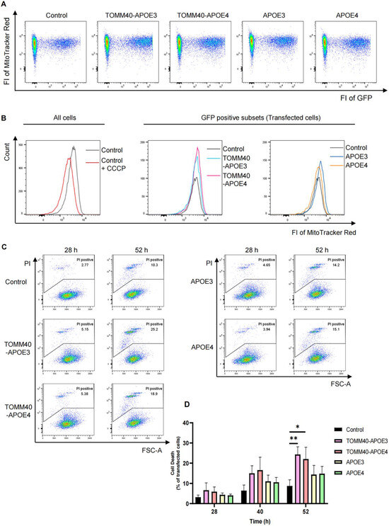 Induction of cell death without affecting mitochondrial membrane potential by TOMM40-APOE3 and TOMM40-APOE4. (A,B) No impact on mitochondrial membrane potential by APOE3, APOE4, TOMM40-APOE3, and TOMM40-APOE4. Neuro 2a cells were co-transfected with pmax-GFP vectors along with one of the following vectors: APOE3-HA, APOE4-HA, TOMM40-APOE3-HA, or TOMM40-APOE4-HA. After 28 h of transfection, MitoTracker Red staining was performed, allowing the assessment of MMP with flow cytometry. (A) The fluorescence of GFP (x-axis), representing transfected cells, and MitoTracker Red (y-axis), indicating mitochondrial membrane potential, were quantified. (B) Histogram displaying the intensity of MitoTracker Red fluorescence in transfected cells. CCCP was an uncoupler of oxidative phosphorylation. (C,D) Induction of cell death by TOMM40-APOE3 and TOMM40-APOE4. Neuro2a cells were co-transfected with piRFP670-N1 plasmid along with indicated plasmids. Then, 28 h, 40 h, and 52 h after transfection, cell death was assessed using propidium iodide (PI) staining and analyzed using flow cytometry. (C) Representative flow cytometric data at 28 h and 52 h. The x-axis indicates FSC-A and the y-axis indicates the fluorescence intensity of PI. The value of “PI positive” is the percentage of the number of dead transfected cells to the total number of transfected cells. (D) Bar graph depicting the percentage of deceased cells among transfected cells at 28 h, 40 h, and 52 h (n = 3). Asterisks (*) represent statistical significance: * p < 0.05 and ** p < 0.01.