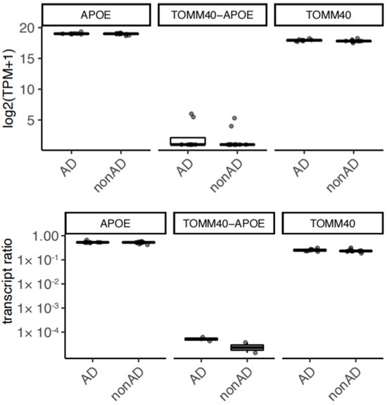 Regarding human brains, we did not find any significant difference in the expression of TOMM40-APOE transcripts between AD and non-AD subjects (Figure 4). The lack of significant results may be attributed to substantial inter-individual variation in transcript expression levels. This variation could require a larger sample size to detect differences with statistical significance. Additionally, variations in cellular fractions within brain samples may have contributed to this variability, as the read-through transcript is predominantly expressed in microglia. Furthermore, a previous study demonstrated that the AD risk allele of TOMM40 increases the expression of read-through transcripts [4], which could explain some of the inter-individual variation. Given the moderate genetic effect, we believe that additional samples, potentially hundreds, would be necessary to achieve statistical significance.