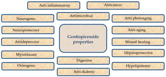 Vast traditional applications of GPS-containing plants encouraged the researchers to study the biological potential of GPS more extensively and broadly. A multitude of scientific reports denoting the marked biological potential of this secoiridoid have been published. Below, the pharmacological potential of the compound that were proved in in vitro tests are reviewed. Some of the major biological activities of GPS are summed in Figure 3.