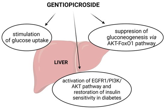 In the experiments conducted by Xu et al. [] on HG-stimulated NRK-52E cells (rat kidney epithelial cells cultured with 30 mM of high glucose), GPS (12.5, 25, and 50 μM) inhibited renal tubulointerstitial fibrosis (TIF—pathological changes that may occur in diabetic nephropathy), which may be related to the glucose-lowering activity of GPS. The activation of casein kinase 2 (CK2) is closely linked to the body disturbance of carbohydrate metabolism and inflammatory reactions []. The secoiridoid may also directly inhibit the CK2/NF-κB inflammatory signaling pathway via angiotensin II type 1 receptor (AT1R) to ameliorate TIF in diabetes. As was confirmed, the effects of GPS that were observed in vitro in HG-stimulated NRK-52E cells were reversed by AT1R over-expression.