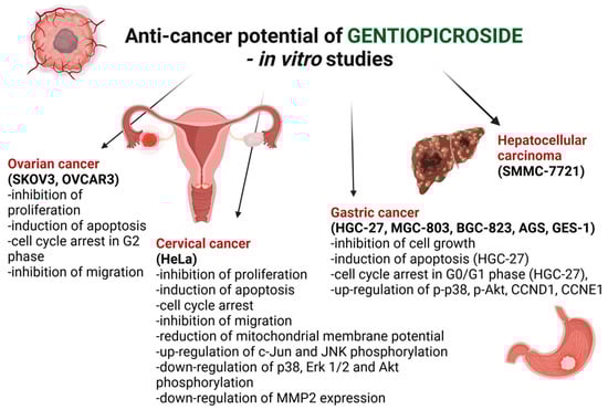 Ovarian cancer encompasses many types of neoplasms with distinct molecular and clinic–pathological features as well as prognoses [,]. Ovarian cancer is the seventh most common cancer with five-year survival rates below 45% and the eighth most common cause of cancer death in women worldwide. The number of cases diagnosed every year is increasing []. It has been demonstrated that gentiopicroside exhibits significant anti-cancer activity against SKOV3 ovarian cancer cells. GPS (IC50 = 20 μM) displays an anti-proliferative effect and inhibits the growth of SKOV3 cells in a dose-dependent manner. Moreover, GPS leads to apoptosis in a concentration-dependent fashion. It has also been detected that the number of cells in the G2 phase of the cell cycle increases after a 40 µM GPS treatment, leading to cell cycle arrest. Additionally, GPS (20 μM/24 h) reduces the migration and motility of SKOV3 ovarian cancer cells in a dose-dependent manner. The inhibition of SKOV3 cancer cell migration suggests that GPS potentially restrains the metastasis of cancer cells. The induction of the mitochondrial apoptosis pathway, cell cycle arrest, and the inhibition of cancer cell migration and invasion indicate that GPS can be considered a promising molecule for the therapy of ovarian cancer [].