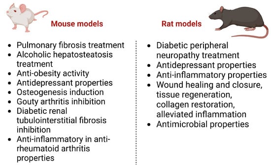 According to scientific databases, recent years have brought the development of in vivo studies on gentiopicroside. Our search performed in the Scopus database showed that the number of scientific articles that cover the topic of the in vivo testing of GPS reached eight annually, whereas, prior to 2014, one article was released annually. This confirms an increasing interest in in vivo studies on GPS that are conducted in various directions. The compound is researched for its antimicrobial, anti-inflammatory, central nervous system-targeting, osteogenic, anti-dermatophyte, anti-diabetic, or weight-reducing properties. The detailed characteristics of the aforementioned properties are presented below and in Figure 4.