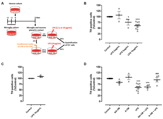 Five days after the preparation of mesencephalic neurons and five to seven days after obtaining the microglia by trypsinization, the two cultures were placed in contact as previously described. Approximately seven hours before being placed in contact, the medium of the two cultures was changed to a non-essential amino acid medium. Two hours after the two cultures were placed in contact, the different CM or GDNF (100 pg/mL, sc-4865, Santa Cruz Biotechnology) were added to the co-culture. Twenty-four hours later, the cells were exposed to LPS (10 µg/mL, L4391, Sigma-Aldrich, St. Louis, MO, USA) for a further twenty-four hours. The coverslips with the neurons were removed, fixed with 4% paraformaldehyde, and then processed for TH immunocytochemistry.