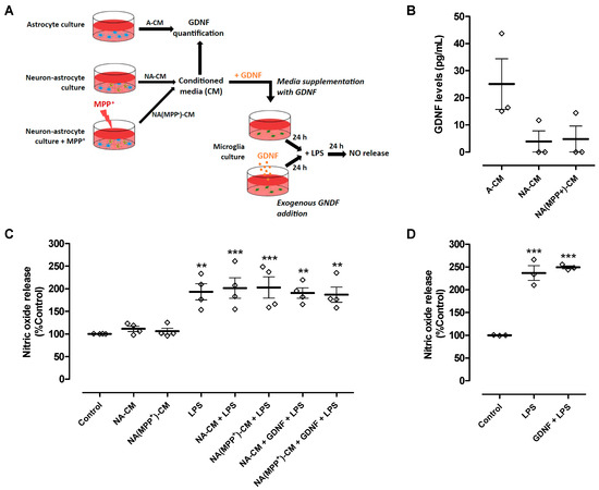 Hence, we determined if supplementing the media with GDNF (100 pg/mL) (Figure 3A) could overcome the inability of neuron-astrocyte secretomes (NA-CM and NA(MPP+)-CM) to prevent LPS-induced NO release by microglial cells and, consequently, achieve DA neuronal protection. The results showed that even after adding GDNF at higher levels than those measured in A-CM, the neuron-astrocyte secretomes were incapable of preventing the LPS-induced increase in NO release (Figure 3C). Exogenous GDNF addition, at the same concentration and in the absence of conditioning (Figure 3A), was also unable to decrease LPS-induced NO release by microglia (Figure 3D). These results showed that the inability of neuron-astrocyte secretomes to modulate NO release by LPS-activated microglia was not due to insufficient GDNF levels.