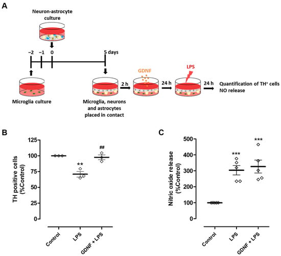 Four to five days after preparing the neuron-astrocyte culture and five to seven days after obtaining the microglia by trypsinization, the two cultures were placed in contact through the medium and incubated with 5-fluorodeoxyuridine (FDU: uridine 68 μM and 5-Fluoro-5′-deoxyuridine 27 μM). The medium of the two cultures was changed to a non-essential amino acid medium at least seven hours before. Two hours after the two cultures were placed in contact, GDNF (100 pg/mL, sc-4865, Santa Cruz Biotechnology, Dallas, TX, USA) was added to the co-culture, and twenty-four hours later, the cells were exposed to LPS (50 µg/mL, L4391, Sigma-Aldrich, St. Louis, MO, USA). Twenty-four hours after adding LPS, the neuron-astrocyte culture was fixed with 4% paraformaldehyde and processed for TH immunocytochemistry. Microglial reactivity was monitored by measuring NO levels in the experimental medium.