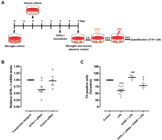 Modulation of microglial reactivity by GDNF depends on the activation of GFRα-1 [17]. Therefore, to investigate whether the DA neuron protection exerted by exogenous GDNF supplementation occurs exclusively via a direct effect on these neurons or if it also involves the regulation of microglial activation, we knocked down the GDNF receptor, GFRα-1, specifically in microglial cells (Figure 5A). We achieved a reduction of about 36.4 ± 9.9% in microglial GFRα-1 mRNA levels compared to the transfection reagent condition (Figure 5B). After GFRα-1 knockdown, microglia were placed in contact with neurons through the medium and exposed to LPS (10 µg/mL) in the presence or in the absence of 100 pg/mL GDNF (Figure 5A). Protection of DA neurons exerted by exogenous GDNF was partially reduced by GFRα-1 knockdown in microglial cells from 110 ± 6.3% to 79.6 ± 6.8% TH positive cells (Figure 5C).