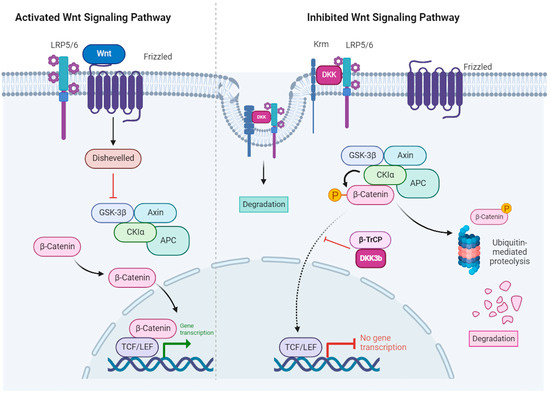 Canonical Wnt signaling in the presence of Wnt ligands (left panel) and inhibition by DKK (right panel). Left panel: Wnt binds to a receptor complex on the cell surface that is composed of Frizzled (FZD) and either lipoprotein receptor-related protein 5 (LRP5) or LRP6. This interaction leads to activation of Dishevelled (DVL) that then inhibits the Axin–glycogen synthase kinase 3β (GSK3β)-adenomatous polyposis coli (APC)-casein kinase 1 (CK1) complex, leading to loss of β-catenin phosphorylation and degradation. β-catenin accumulates in the cytoplasm and translocates to the nucleus, where it activates the transcription factors T-cell factor (TCF) and lymphoid enhancer factor (LEF). Right panel: Dickkopf (DKK) inhibits Wnt–β-catenin signaling. DKK binds to LRP5/6, preventing its interaction with FZD. Additionally, it collaborates with Kremen (Krm) to trigger internalization and degradation of the LRP6-DKK complex. Finally, the protein complex (DVL-GSK3β-APC-CK1-Axin) facilitated the phosphorylation of β-catenin leading to its ubiquitinylation and degradation by the proteasome (adapted from Schunk et al., 2021 [17]). Canonical Wnt signaling inhibition by diffusible DKKs is brought about by their binding to the LRP5/6 FZD co-receptor. It has been proposed that extracellular DKK-3 triggers LRP5/6 internalization and degradation via binding to Kremen1/2. The non-secreted DKK-3b isoform was shown to interact with the ß-TrCP ubiquitin–ligase and impair ß-catenin translocation. Created with BioRender.com (accessed on 18 December 2023).