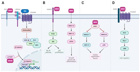 Snelling et al. demonstrated that incubation of primary human chondrocytes or chondrosarcoma cells with recombinant DKK-3 protects against in vitro cartilage degradation through enhanced TGF-β signaling, and DKK-3 expression is regulated by both injury and inflammatory cytokines [39]. Intracellular and extracellular DKK-3 play crucial roles in preventing cardiac hypertrophy [63] and promote the differentiation of stem cells into vascular smooth muscle cells [41], via the activation of several intracellular signaling pathways, including the ASK1/JNK/p38 [apoptosis signal-regulating kinase 1 (ASK1)-c-Jun N-terminal kinase (JNK)/p38] and MEK/ERK/ATF6 axes, respectively (Figure 3B,C).