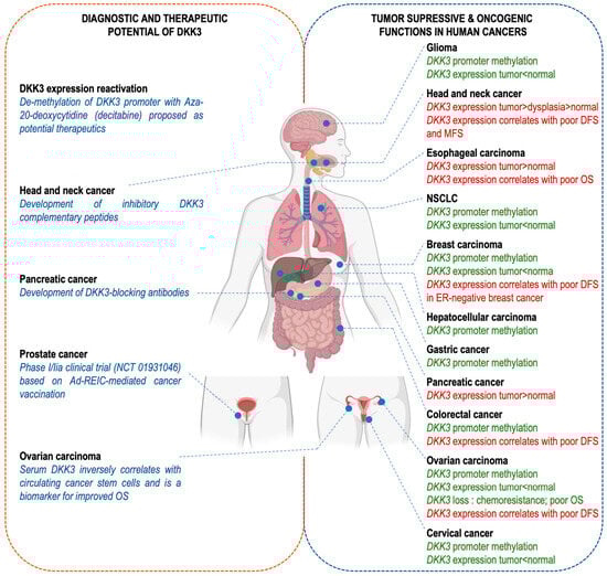 The dual role of DKK-3 in cancer: implications for diagnosis, prognosis and therapeutic strategies. DKK-3 has been reported to play a role in human cancer progression and/or response to treatment. However, its function has been described as tumor-suppressive (green text; right panel) or oncogenic (red text; right panel) depending on the cellular and tissue context. In addition, DKK-3 is a potentially interesting tool, both as a prognostic biomarker or a druggable therapeutic target (left panel). Created with BioRender.com (accessed on 11 November 2023).