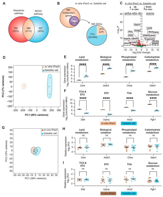 Transcriptional profile of metabolic programs in murine iPax3 myogenic progenitors compared to adult satellite cells. (A) Venn diagram of genes annotated to metabolic pathways with the Reactome and KEGG databases. (B) Venn diagram showing overlap between differentially expressed genes (DEGs) after pairwise comparisons and genes annotated to metabolic pathways (top), as well as a breakdown of upregulated (brown) and downregulated (blue) DEGs (bottom). (C) Volcano plot for 986 metabolic genes. (D) Principal component analysis (PCA) of bulk RNA-seq in in vitro iPax3 (orange) and satellite cells (blue). (E,F) Representative gene expression levels of in vitro iPax3 myogenic progenitors (orange) vs. satellite cells (blue) across metabolic pathways enriched in cluster 1 (E) and cluster 2 (F). (G) PCA of microarray in in vivo iPax3 myogenic progenitors (brown) and adult satellite cells (blue). (H,I) Representative gene expression levels of in vivo iPax3 myogenic progenitors (brown) vs. satellite cells (blue) across metabolic pathways previously enriched in cluster 1 (H) and cluster 2 (I). Studies represent three biological samples per group. **** p < 0.0001 by ANOVA with Bonferroni correction. Abbreviations: Tricarboxylic acid (TCA), Electron Transport Chain (ETC).