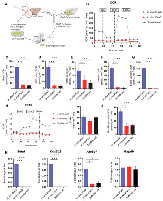 Bioenergetics of PSC-derived myogenic progenitors and re-isolated donor-derived satellite cells. (A) Outline of experiments. (B) Typical traces of real-time OCR before and after the addition of inhibitors to derive several parameters of mitochondrial respiration in Pax3 in vitro, iPax3 in vivo, and adult satellite cells (SC). (C) Initially, basal O2 consumption OCR was measured, from which basal cellular respiration can be derived by subtracting non-mitochondrial respiration. (D) ATP-linked represent the difference in OCR before and after Oligomycin. (E) H+ leak-linked OCR in Pax3 in vitro, iPax3 in vivo, and adult SC represent the difference in OCR after Oligomycin injection and Antimycin A and Rotenone. (F) Maximal OCR was determined via addition of a mitochondrial uncoupler CCCP that stimulates maximal respiration by mimicking a physiological energy demand, leading to an increase in oxygen consumption. (G) Spare respiratory capacity OCR reflects the difference between basal and maximal respiratory rate, and this capacity was determined by measuring OCR after treatment with oligomycin and CCCP. (H) Real-time whole-cell extracellular acidification rate (ECAR) is an indicator of the rate of acid efflux formed during glycolytic energy metabolism used to generate ATP. (I) ECAR quantification in iPax3 in vitro, iPax3 in vivo, and adult SC. (J) Non-mitochondrial respiration OCR has been observed at low levels in iPax3 in vivo and Adult SC. (K) Graphs shows gene expression for Sdhd, Cox6b2, Atp5c1, and gapdh. Results are normalized to Actb. Data are presented as mean ± SEM (n = three biological samples per group). * p < 0.05, ** p < 0.01, and *** p < 0.001 from one-way ANOVA followed by post hoc Tukey.
