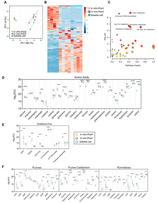 Metabolomics profiling of in vitro-generated iPax3 myogenic progenitors and post-transplant re-isolated iPax3 donor-derived satellite cells. (A) PCA of metabolomics data generated from in vitro iPax3 myogenic progenitors and re-isolated iPax3 donor-derived satellite cells (in vivo), along with satellite cells (n = four per group). (B) Hierarchical clustering analysis of these data color-coded from blue to red according to z-score. (C) Pathway enrichment analysis of ANOVA significant (p < 0.05) features. The size of each circle corresponds to its enrichment factor and color corresponds to p-value (from white to red). Individual values (log2[peak area in arbitrary units]) are shown for (D) amino acids, (E) glutathione, (GSH) homeostasis, and (F) purine and pyrimidine metabolism are shown. * p < 0.05, ** p < 0.01, *** p < 0.001, **** p < 0.0001, from two-way ANOVA comparisons.