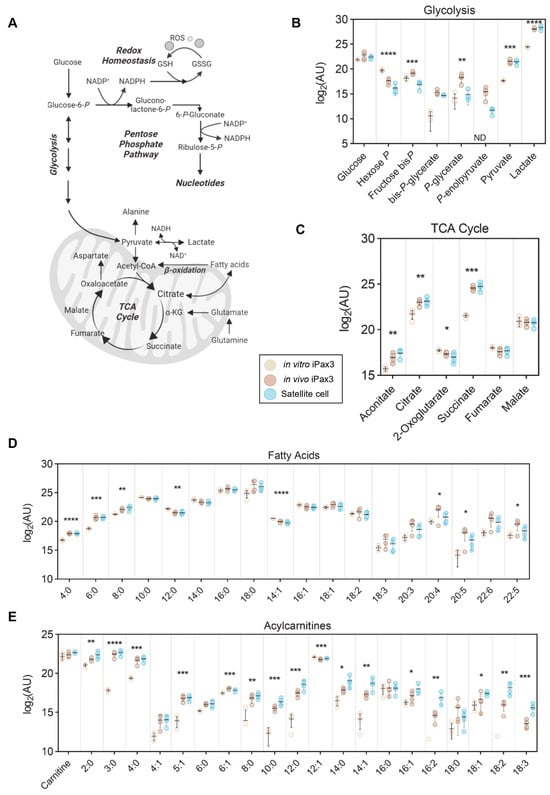 Energy metabolism of in vitro-generated iPax3 myogenic progenitors and re-isolated iPax3 donor-derived satellite cells. (A) A pathway map along with individual values (log2[peak area in arbitrary units]) are shown for (B) glycolysis, (C) tricarboxylic acid (TCA) cycle, (D) fatty acids, and (E) acylcarnitines. * p < 0.05, ** p < 0.01, *** p < 0.001, **** p < 0.0001, from two-way ANOVA comparisons.