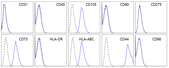 In this study, we used T-MSCs isolated from human palatine tonsillar tissues. To characterize the profile of T-MSCs, we performed flow cytometry (Figure 1). The cells were positively labeled with human MSC markers such as CD44, CD73, CD105, and HLA-Class I, but negative for hematopoietic antigens (CD45 and HLA-DR), endothelial cell markers (CD31), and co-stimulatory molecules (CD80 and CD86).