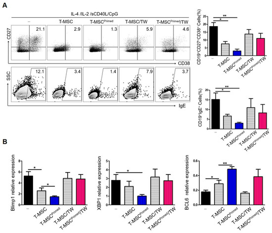 Suppression of B cell activation by primed T-MSCs requires direct cell contact: (-), non T-MSC group. (A) To separate TMCs from T-MSCs in B cell-activating conditions, TMCs were co-cultured with T-MSC or T-MSC primed in 24-well transwell plates with a 0.4-mm pore membrane for 5 d. The phenotype of ASCs and IgE production of B cells was analyzed by FACS. (B) RNA was isolated from B cells of TMCs co-cultured for 5 d under B cell-activating conditions. The mRNA expression of Blimp-1, XBP-1, and BCL-6 was analyzed by real-time PCR. In vitro experiments were conducted in triplicates. The results are shown as the mean ± SD. * p < 0.05, ** p < 0.01.