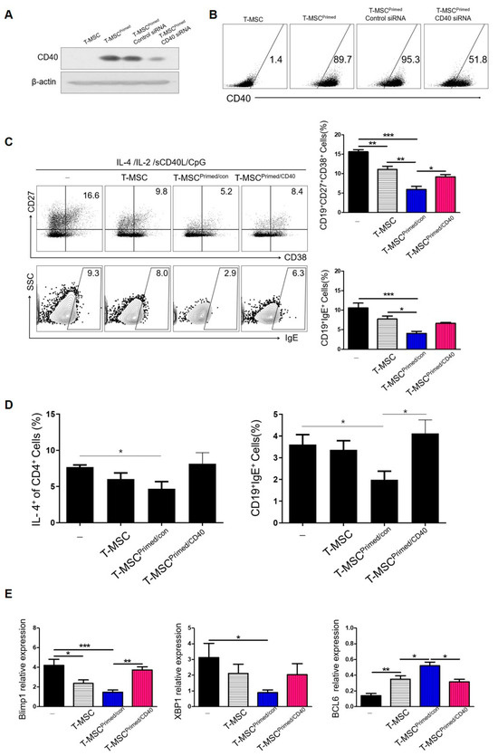 To investigate the role of CD40 as a regulator of B cell activation by primed T-MSCs, we knocked down CD40 using CD40-specific siRNA. Western blotting and FACS analyses confirmed that the expression of CD40 was substantially decreased in primed T-MSCs after CD40 knockdown (Figure 5A,B). Under B cell-activating conditions, compared to primed T-MSCs transfected with control siRNA, CD40-knockdown primed T-MSCs significantly increased the induction of ASCs and IgE production in TMC (Figure 5C).