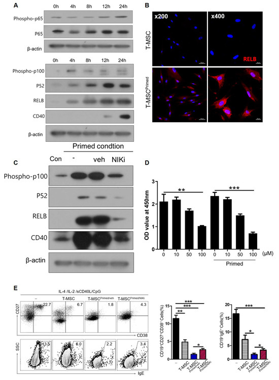 Non-canonical NF-κB pathway in T-MSCs upregulated CD40 expression: (-), non T-MSC group. (A) Western blot analysis of non-canonical and canonical NF-κB pathway in T-MSCs primed with TNF-α/IFN-γ. (B) Immunofluorescence staining of RELB expression in control and primed T-MSCs. DAPI was used for nuclear staining. (C) Western blot analysis of inhibition of the non-canonical pathway of NF-κB using NIK inhibitor (NIKi) in T-MSCs primed with TNF-α/IFN-γ. (D) CCK-8 assay: Effect of NIKi at different concentrations on T-MSCs. (E) In stimulating B cells, TMCs were cultured without T-MSC or co-cultured with T-MSCs or T-MSCprimed/veh or T-MSCprimed/NIKi for 5 d, and analyzed for IgE production and ASC phenotype of B cells by flow cytometry. Data are shown as the mean ± SD. * p < 0.05, ** p < 0.01, *** p< 0.001.