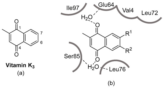 (a) The structure of Vitamin K3 and (b) the Vitamin K3 (R1 and R2 = H) binding site in QuMo.