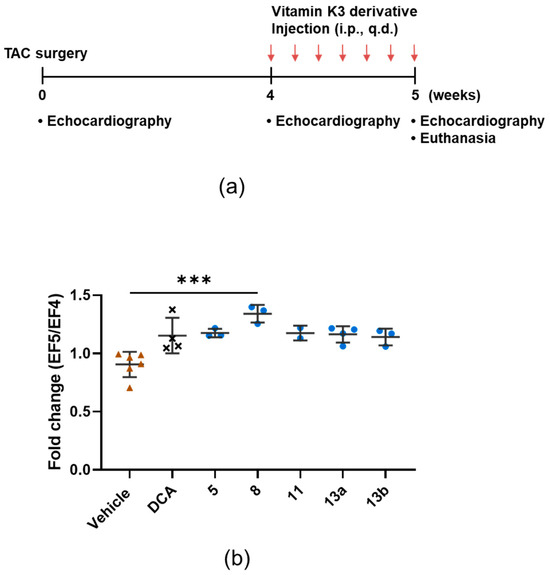 Vitamin K3 derivatives (5, 8, 11, 13a, and 13b) improve the ejection fraction (EF). (a) Study design. Echocardiographs were acquired before, at 4 weeks, and 5 weeks after TAC induction. Starting from week 4, each derivative was intraperitoneally (i.p.) injected into mice whose EF was lower than 55% once a day (q.d.) for a week (indicated by red arrows). Mice were euthanized 5 weeks after TAC induction. (b) Scatter dot plot showing means ± SD of the change in EF (after a week of daily PDK4 inhibitor injection). The change in magnitude was calculated by dividing the EF at week 5 (EF5) using the EF at week 4 (EF4). The Kruskal–Wallis test, followed by Dunn’s multiple comparison test. *** p < 0.001.