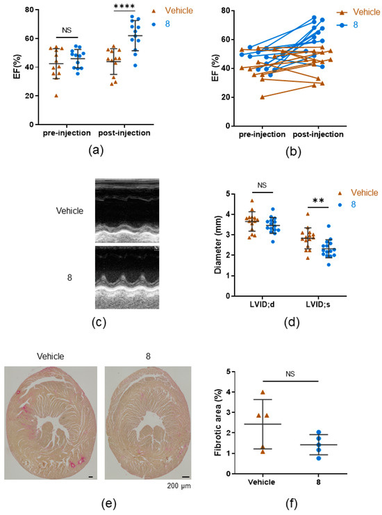 Recovery from heart failure with reduced ejection fraction (HFrEF) after 7 days of daily treatment with 8. (a) Scatter dot plot showing means ± SD of EF 4 weeks after a transverse aortic constriction operation (per-injection) and EF after 7 days of daily vehicle (n = 8) or 8 (n = 9) treatment following a 4-week incubation after the TAC operation (post-injection). Two-way ANOVA with Bonferroni’s multiple comparisons test. **** p < 0.0001. (b) EF of individual mice before and after injections of 8. (c) Example of M-Mode echocardiography of left ventricles of vehicle-injected and 8-injected mice that received the TAC operation (TAC mice). (d) Left ventricular internal diameter at end-diastole (LVIDd) and left ventricular internal diameter at end-systole (LVIDs) of vehicle-injected and 8-injected TAC mice. Mann–Whitney U test. NS = not significant. ** p < 0.01. (e) Heart sections of TAC mice stained with Sirius red. Fibrotic areas are stained pink. Scale bar: 200 µm. (f) Statistical results for fibrotic areas of heart sections of vehicle-injected and 8-injected TAC mice. NS = not significant.