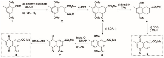 First, we focused on the derivatization of the C7 position of Vitamin K3 (Scheme 1). According to the method of Maloney et al. [19], common intermediate 1 was synthesized in 5 steps from o-cresol. As shown in Scheme 1, the Stobbe reaction of 1 with dimethyl succinate, followed by reduction with Pd/C, yielded 2 in 73% yield for two steps [20]. An intramolecular Friedel–Crafts reaction with polyphosphoric acid (PPA) led to cyclic 3 in 86% yield. Then, silane reduction of 3 quantitatively yielded decarboxylated product 4. Finally, aromatic cyclization with DDQ and oxidation with CAN afforded 5, possessing a methylcarbonyl group at the C7 position. In addition, we attempted to introduce a hydroxyl group at the C5 position to verify the effect of introducing a proton donor into 5. The carbonyl group of 3 was reduced through the treatment of LDA with I2 to afford phenol 6. The resulting hydroxyl group of 6 was then protected with an acetyl group and oxidized with CAN to form the 1,4-naphthoquinone skeleton 7. Finally, the acetyl group was removed using HCl/MeOH to construct the C5,7-di-substituted derivative 8.