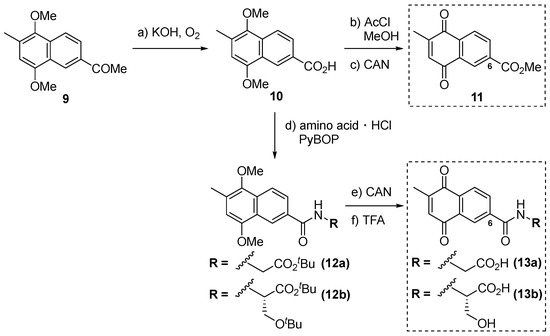 On the other hand, derivatization of the C6 position of Vitamin K3 was achieved with a Friedel–Crafts reaction using the electron orientation of the C2 methyl group. According to known methods, including the Friedel–Crafts reaction, the acetylated product 9 was synthesized from Vitamin K3 in three steps [21]. Then, air oxidation of the methyl-ketone moiety in 9 under basic conditions produced carboxylic acid 10 in 72% yield [21,22] (Scheme 2). Methyl esterification of 10 with HCl in MeOH, followed by oxidation with CAN, efficiently yielded the C6-methyl ester 11. To further investigate the effect of the C6 position on inhibitory activity, 10 was subjected to condensation reactions with Gly-OtBu and Ser(tBu)-OtBu. These condensations were advanced using PyBOP as a condensation reagent, affording 12a and 12b, respectively. Subsequent oxidation with CAN and deprotection of tBu by treatment with TFA achieved the synthesis of 13a and 13b, with an amino acid side chain at the C6 position of Vitamin K3.