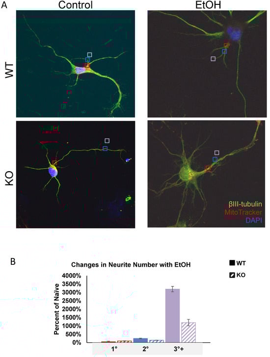 Primary cultured hippocampal neurons with and without EtOH. (A) Representative immunofluorescence labeling of βIII-tubulin (for cell body and dendrite), MitoTracker (for mitochondria) and DAPI (for nucleus) expression in WT and KO neurons. Primary (red squares), secondary (blue squares), and tertiary (violet squares) neurites were counted. (B) Total neurites from WT and KO naïve and EtOH-treated neurons were counted and the percentages of primary (red), secondary (blue), and tertiary (purple) neurites were calculated for EtOH-treated relative to naïve groups at 3 DIV.