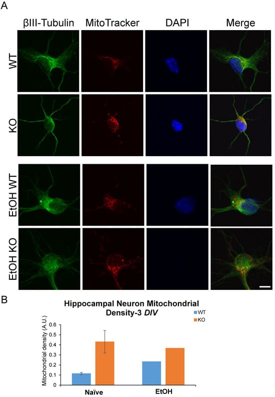 Primary cultured hippocampal neurons with and without EtOH. (A) Immunofluorescence labeling of βIII-tubulin, MitoTracker, and DAPI expression in WT and KO neurons at 3 DIV. (B) MitoTracker intensity in primary cultured hippocampal neurons.