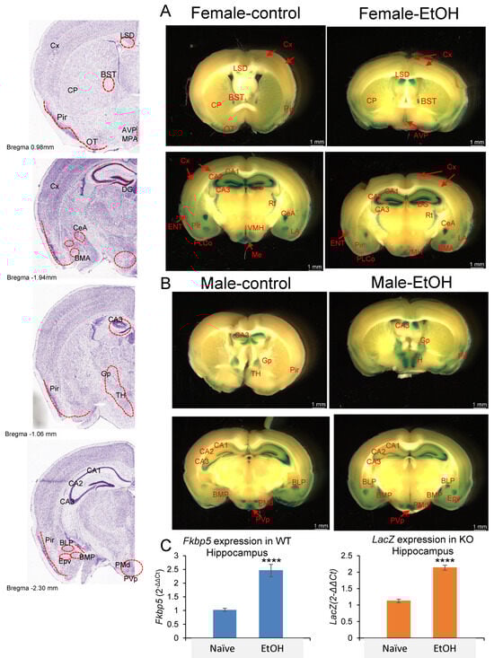 Given the presence of the LacZ reporter gene in Fkbp5 KO mice, X-gal staining was used to detect blue coloration in the brain as a surrogate for Fkbp5 expression []. We examined its expression in both sexes and with alcohol treatment, while obtaining better resolution than has been previously reported []. Brain areas where Fkbp5 is highly expressed were clearly identified in both male and female mice without or with alcohol (2 g/kg BW) injection (Figure 3A,B). Among hippocampal subregions, the granular cell layer of DG and pyramidal cells of CA3 possessed the highest expression levels. Ventral medial hypothalamus, amygdala nucleus, and reticular nucleus of thalamus (Rt) are also higher-expressing areas, with enhanced signal in specific subareas and nuclei. Notably, high expression was observed in limbic structures including amygdala, hypothalamus, and hippocampus; areas involved in alcohol addiction. In addition to brain region expression, layer-specific expression patterns may indicate functional connections between regions. A medium level of FKBP51 expression was found in a continuous layer of cortex layer 4, entorhinal cortex (ENT) layer 2/3, piriform area (Pir), piriform amygdala area (PAA), and cortical amygdala area, posterior part, lateral zone (COApl). ENT is a nodal point of cortical–hippocampal cross talk. Lower expression in cortex layer 2/3 was found to connect through ENT layer 2/3 (Figure 3A). RNA quantification confirmed hippocampal upregulation of Fkbp5 mRNA in WT mice and LacZ reporter mRNA in Fkbp5 KO mice following EtOH injection (Figure 3C).