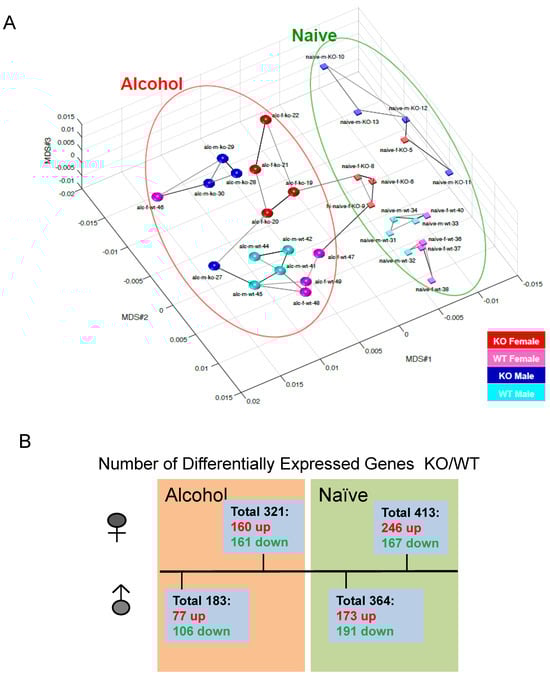Mice at the average age of 3–4 months old were produced from 2 KO breeding trios and 4 WT breeding pairs of mice. For no alcohol control (naive) groups, mice were randomly assigned to KO-male-naïve (N = 4), KO-female-naïve (N = 4), WT-male-naïve (N = 4), and WT-female-naïve (N = 4); for alcohol groups, the same number of mice were used, they are KO-male-alcohol (N = 4), KO-female-alcohol (N = 4), WT-male-alcohol (N = 4), and WT-female-alcohol (N = 4). These mice were used for hippocampal dissection following the published method []. A total of 32 RNA samples were isolated using TRIzol® followed by RNeasy Mini kit purification (Qiagen, Valencia, CA, USA). Sequencing libraries were constructed using the Illumina TruSeq RNA sample preparation protocol. The resulting libraries were sequenced on an Illumina HiSeq™ 2000 using a standard single-end 50 bp sequencing protocol. The reads were aligned to the reference Mus musculus genome (UCSC build MM9) with TopHat []. No more than 2 mismatches were allowed in the alignment. HTseq was used to count gene expression (reads) [], and DEseq [] was used to find differentially expressed genes (DEGs) after performing median normalization. DEGs were identified with adjusted p-values of <0.05 for multiple tests using the Benjamini–Hochberg adjustment [] and sequence read abundances per gene above 40% within each sample. The significant genes with Fold Change (FC) > 2 were further analyzed. Heatmaps of gene expression levels were generated with R/heatmap2. Genes differentially expressed between KO and WT were analyzed with the functional annotation tool of the DAVID bioinformatics resources 6.7 (http://david.abcc.ncifcrf.gov, accessed on 29 October 2023). Analysis software (IPA, Qiagen, Redwood City, CA, USA) was also applied for the identification of potentially important biological mechanisms and pathways. RNA-seq data have been submitted to a public database (GEO access ID: GSE143354).