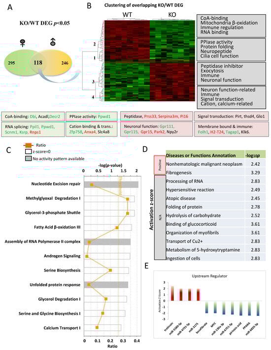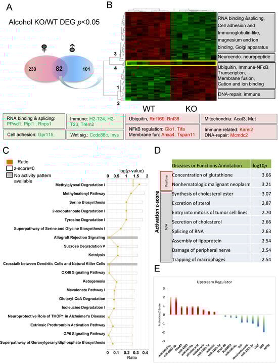Pathway analysis of DEGs in alcohol-treated comparisons between Fkbp5 KO and WT. (A) Number of DEGs identified for male and female naïve comparisons. (B) Heatmap shows the up- and downregulated genes, which clustered into four groups (functions indicated on the right). (C) Canonical pathway analysis of overlapping genes following alcohol treatment. The list of top networks with their scores obtained from IPA including −log (p-value) and ratio. The y-axis represents the top canonical pathways as calculated by IPA based on DEGs (union genes) and the x-axis represents the ratio of number of genes from the dataset that map to the pathway to the number of all known genes ascribed to the pathway. The light-yellow line represents the threshold of p-value < 0.05 as calculated by Fischer’s test. (D) IPA analysis-identified diseases or functions. Significance was indicated by −log p-value, and activation state indicated by positive or negative mark. (E) Upstream regulators prediction.