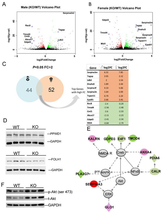 (A,B) The most significant DEGs displayed in volcano plots for male and female comparisons. (C) Number of sex-specific and overlapping genes. (D) Protein expression of select targets. (E) Representative identified DEG-associated gene network, which functions in endocrine system, development, lipid metabolism, and small molecule biochemistry. Green color represents downregulation, and red color represents upregulation of genes in KO relative to WT. (F) KO exhibits higher total and phospho-Akt (Ser 473) relative to WT.