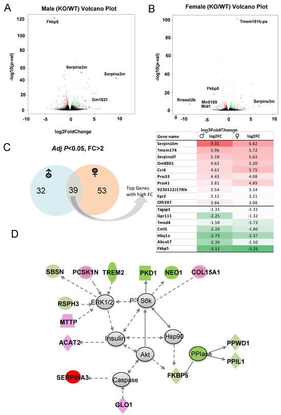 (A,B) The most significant DEGs displayed in volcano plots for male and female comparisons. (C) Number of sex-specific and overlapping genes. (D) Representative identified DEG-associated gene network affected by knocking out Fkbp5 after alcohol treatment. Green represents downregulation, and red represents upregulation of genes in KO relative to WT.