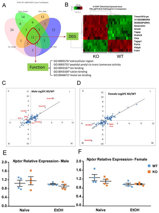 Overlapping genes and sex-specific effects on gene expression in all comparisons. (A) Sex-specific, treatment-specific DEGs between KO and WT were plotted. (B) Heatmap shows the 12 overlapping DEGs among all groups. (C,D) Identification of sex-specific responses to alcohol treatment between KO and WT. (E,F) Relative mRNA expression of Nptxr in naïve and alcohol-treated, male and female, KO and WT.