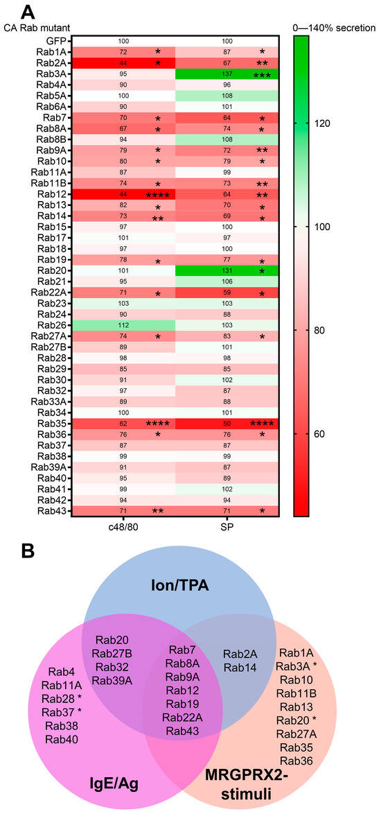 Expression of CA Rab mutants affects MRGPRX2-mediated release of the SG reporter NPY-mRFP. (A) RBL-MRGPRX2 cells were co-transfected with 20 μg NPY-mRFP and 30 μg of the indicated pEGFP-CA Rab mutants. Cells were then either left untreated or stimulated for 30 min with either 1 μg/mL c48/80 or 10 μM SP. NPY-mRFP release was measured and compared with release from cells co-expressing NPY-mRFP and pEGFP, set as 100%. Data are the means ± SEM (n = 3–8). Statistical significance was determined by one-way ANOVA, followed by Dunnett’s post-test (* p < 0.05, ** p < 0.01, *** p < 0.001, **** p < 0.0001). (B) Venn diagram of CA Rab mutants that inhibit or potentiate (marked by asterisk) secretion of NPY-mRFP release, which is co-expressed with the Rab mutant, in response to either cell trigger type, or that selectively affect secretion of NPY-mRFP that is induced by either MRGPRX2 stimuli or by Ion/TPA, but not by IgE/Ag, or Rabs that exclusively affect either MRGPRX2 or IgE/Ag-induced secretion of NPY-mRFP.