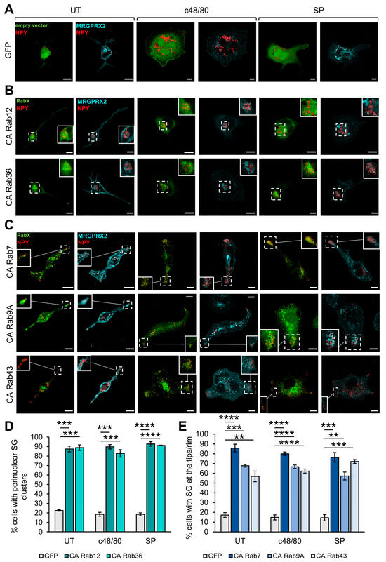 Inhibitory Rabs that affect the SG positioning. RBL-MRGPRX2 cells were co-transfected with 20 μg NPY-mRFP (red) and 30 μg of pEGFP empty vector (A), or pEGFP-CA Rab12 or CA Rab36 (B), or CA Rab7, CA Rab9A or CA Rab43 (C) (green) and either left untreated (UT) or stimulated for 30 min with either 1 μg/mL c48/80 or 10 μM SP, as indicated. Cells were immunostained with anti-HA antibodies followed by Alexa Fluor® 647-conjugated secondary antibodies (pseudo color cyan). Insets are enlargements of the boxed areas. Scale bar = 10 μm. The incidence of cells with perinuclear SGs (D) and the incidence of cells with SGs at the cell tips (E) were quantified from at least three independent experiments with 15–20 cells in each and are displayed as percentage of total cells. Data are the means ± SEM (n = 3–4, 15–20 cells each). Statistical significance was determined by one-way ANOVA, followed by Dunnett’s post-test (** p < 0.01, *** p < 0.001, **** p < 0.0001).