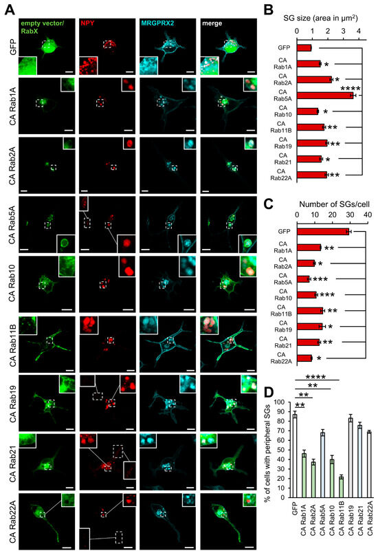 Rabs that enlarge the SGs. RBL-MRGPRX2 cells were co-transfected with 20 μg NPY-mRFP (red) and 30 μg of either empty pEGFP vector or the indicated pEGFP-CA Rab mutants (green). Cells were immunostained with anti-HA antibodies followed by Alexa Fluor® 647-conjugated secondary antibodies (pseudo color cyan) and visualized by confocal fluorescence microscopy (A). Insets are enlargements of the boxed areas. Scale bar = 10 μm. The mean SG area (B) and the number of SGs/cell (C) were quantified using Fiji ImageJ (Version 2.9.0/153t). Cells that contain peripheral SGs were counted and their incidence is presented as percentage of the total cells analyzed in at least three independent experiments with 15–20 cells each (D). Data are the means ± SEM (n = 3–5, 15–20 cells each). Statistical significance was determined by one-way ANOVA followed by Dunnett’s post-test in (B–D) (* p < 0.05, ** p < 0.01, *** p < 0.001, **** p < 0.0001).