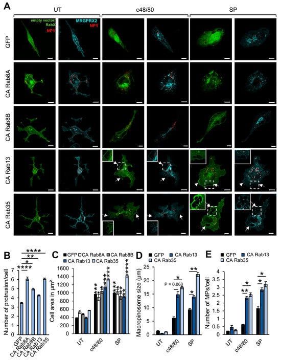 Rabs that affect cell morphology. RBL-MRGPRX2 cells were co-transfected with 20 μg NPY-mRFP (red) and either empty vector or 30 μg of pEGFP-CA Rab8A, CA Rab8B, CA Rab13, or CA Rab35 (green) (A). Cells were then either left untreated (UT) or stimulated for 30 min with either 1 μg/mL c48/80 or 10 μM SP, as indicated. Cells were immunostained with anti-HA antibodies followed by Alexa Fluor® 647-conjugated secondary antibodies (pseudo color cyan) and visualized by confocal microscopy. Insets are enlargements of the boxed area. Arrows point to macropinosomes, arrowheads point to macropinocytic cups. Scale bar = 10 μm. The number of protrusions/cell (B), the cell area (C), the size of macropinosomes (D), and number of macropinosomes/cell (E) were calculated as described under Materials and Methods. Data are the means ± SEM (n = 3–4, with 15–20 cells each). Statistical significance was determined by one-way ANOVA, followed by Dunnett’s post-test (* p < 0.05, ** p < 0.01, *** p < 0.001, **** p < 0.001; ● p [CA Rab8A: UT vs. c48/80] = 0.1092). The asterisks in (C) indicate statistical significance in comparison to their respective untreated control.