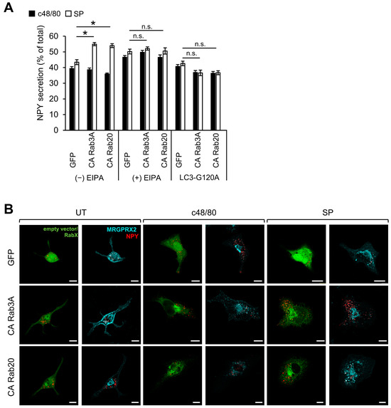 CA Rab3A and CA Rab20 potentiate SP-induced secretion. RBL-MRGPRX2 cells were either co-transfected with 10 μg NPY-mRFP and 15 μg pEGFP-LC3G120A and 15 μg of either empty vector (GFP), or pEGFP-CA Rab3A, or pEGFP-Rab20 (A), or co-transfected with 20 μg NPY-mRFP (red) and either 30 μg pEGFP-CA Rab3A or pEGFP-CA Rab20 (green) (B). Cells were then either left untreated or pre-incubated for 30 min with 50 μM EIPA, and then stimulated for 30 min with either 1 μg/mL c48/80 or 10 μM SP as indicated (A,B). Release of NPY-mRFP is presented as percentage of total (A). Cells were immunostained with a monoclonal anti-HA antibody followed by Goat Anti-Mouse IgG H&L (Alexa Fluor® 647) (pseudo color cyan) (B). Insets are enlargements of the boxed areas. Scale bar = 10 μm. Data are the means ± SEM [n = 6–7 in (A) and n = 3–4, 15–20 cells each in (B)]. Statistical significance was determined by one-way ANOVA, followed by Dunnett’s post-test (* p < 0.05, n.s. (= not significant) ≥ 0.05).