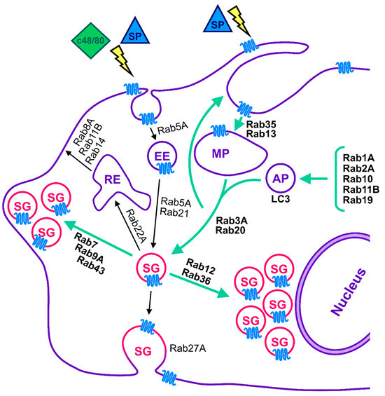 Model for the regulation of MRGPRX2-mediated secretion by Rab GTPases. According to our model, MRGPRX2-mediated secretion is regulated by Rab GTPases that also control both IgE/Ag and Ion/TPA-dependent secretion, but also by unique Rabs. The latter may reflect the distinct modes of exocytosis that are triggered by the distinct stimuli [43] or the influence of MRGPRX2 route of trafficking, which we have previously shown to include, in addition to endocytosis, macropinocytosis and fusion with autophagosomes [25] on its triggered responses. Green arrows indicate the Rab-regulated pathways that stand out as modulators of MRGPRX2-mediated exocytosis. These pathways include the bidirectional transport of the SGs, their plus end transport is influenced by Rab7, Rab9A, and Rab 43, whose constitutive activation results in SG accumulation at cell tips, and their minus end transport that is regulated by Rab12 and Rab36, whose constitutive activation leads to perinuclear accumulation of the SGs. The second pathway, regulated by Rab1A, Rab2A, Rab3A, Rab10, Rab11B, Rab13, Rab19, Rab20, and Rab35 reveals the novel feedback association between macropinocytosis and macropinosome resolution, the close association between macropinocytosis and exocytosis, and the role of autophagosome formation in macropinosome resolution and SG enlargement. Also indicated are Rabs that were screened in this study, and whose functions are based on literature reports.