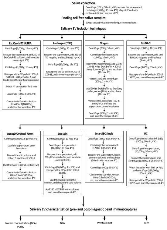 To circumvent the issue of obtaining large volumes of saliva in each individual for the first experiment (i.e., 24 mL of saliva/participant = 500 µL of saliva × 8 EV isolation techniques × 6 replicates), saliva samples obtained from three participants per group of age were pooled in each of the six replicates conducted on different days. Each replicate (N = 6) resulted from mixing 1.5 mL of saliva from each participant until reaching 4 mL (500 µL of saliva × 8 EV isolation techniques = 4 mL).