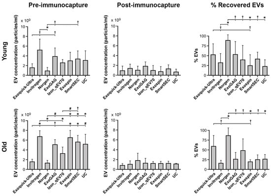 Salivary EV yield obtained with each technique (N = 6 replicates) before and after magnetic bead immunocapture with anti-CD9, -CD63, and -CD81 antibodies (left and middle columns, respectively) in younger and older adults (top and bottom rows, respectively). The right column shows the percentage of recovered salivary EVs obtained with each technique after magnetic bead immunocapture. Due to the lack of significant age × technique interaction on the percentage of recovered salivary EVs, the results of the post hoc analysis for the EV isolation techniques were identical in the two age groups. Statistical differences in EV yield between techniques resulted from post hoc comparisons as long as a significant main or interaction effect was previously obtained with aligned ranks transformation ANOVAs. The p-values were adjusted by a Bonferroni correction for multiple comparisons. Statistical significance is expressed as † (p ≤ 0.05); # (p ≤ 0.001); * (p ≤ 0.0001).