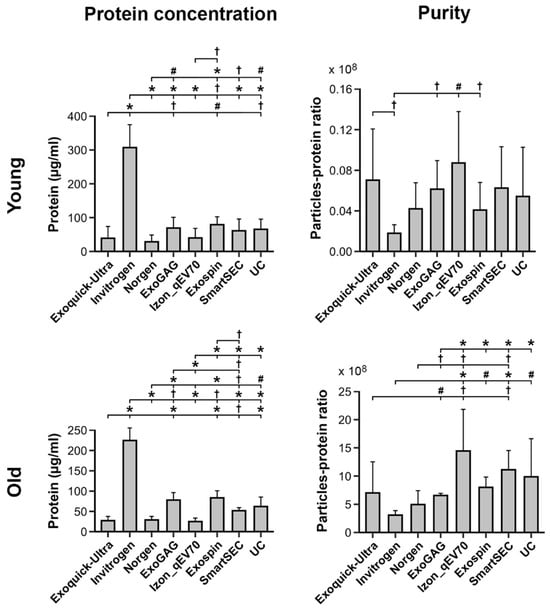 Protein concentration and purity of salivary EVs (left and right columns, respectively) obtained with each technique (N = 6 replicates) before magnetic bead immunocapture with anti-CD9, -CD63, and -CD81 antibodies in younger and older adults (top and bottom rows, respectively). Statistical differences in protein concentration or purity between techniques resulted from post hoc comparisons as long as a significant main or interaction effect was previously obtained with aligned ranks transformation ANOVAs. The p-values were adjusted by a Bonferroni correction for multiple comparisons. Statistical significance is expressed as † (p ≤ 0.05); # (p ≤ 0.001); * (p ≤ 0.0001).