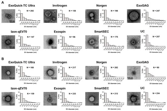 A total of 30 images (6 replicates × 5 images/EV isolation technique) acquired at 10,000× magnification (1.48 × 1.48 nm/pixel) were analyzed manually using the ImageJ software (version 1.43, U.S. National Institutes of Health, Bethesda, MA, USA). Salivary EVs were distinguished from the background and non-EV particles on the basis of their morphology and contrast properties. In general, electron-dense membranous structures with high-contrast edges, rounded or “cup-shaped”, with diameters ranging from ≈30 to 250 nm were considered EVs. EVs located on the edges of the image were excluded when the diameter of such EVs could not be reliably determined.