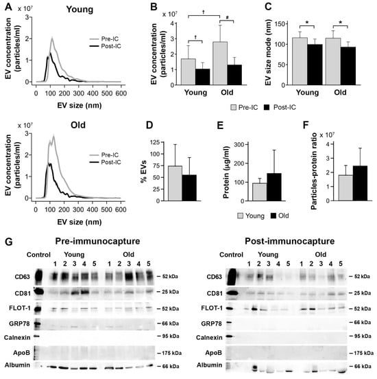 Age effects on salivary EVs obtained with Norgen’s Saliva Exosome Purification Kit comparing 10 younger vs. 10 older adults. (A) NTA characterization of salivary EVs before and after magnetic bead immunocapture with anti-CD9, CD63, and CD81 antibodies in younger and older adults. Age differences in salivary EV concentration (B), size mode (C), percentage of recovered EVs after magnetic bead immunocapture (D), level of protein concentration estimated with BCA before magnetic bead immunocapture (E), salivary EV purity estimated with the particle-to-protein ratio before magnetic bead immunocapture (F), and western blot analyses of salivary EVs obtained before (left panel) and after magnetic bead immunocapture (right panel) in 5 younger and 5 older adults (G). Statistical significance is expressed as † (p ≤ 0.05); # (p ≤ 0.01); * (p ≤ 0.001). IC: immunocapture; nm: nanometers.