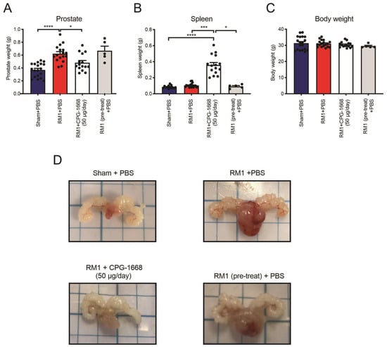 Utilizing an orthotopic syngeneic in vivo model of prostate cancer [41], C57BL6/J mice were injected with either the vehicle or RM1 cells into the ventral lobe of the mouse prostate. RM1-engrafted mice developed sizeable tumors in their prostates resulting in significantly heavier prostates (~70%) compared to the sham controls (Figure 1A,D). On the same day of tumor engraftment surgery, all mice were subcutaneously implanted with osmotic minipumps along the left scapular line of each mouse, and these contained either PBS (as a vehicle) or CPG-1668 (enabling the delivery of 50 µg per day). An additional group was included whereby RM1 cells were pretreated for 1 h with CPG-1668 (10 µg/mL) prior to engraftment surgery, and these mice were implanted with minipumps containing PBS only. Constant infusion of CPG-1668 resulted in significantly suppressed tumor development compared to mice that received a constant infusion of PBS, which was consistent with the difference in prostate weights (Figure 1A,D). Mice engrafted with CPG-1668 pretreated RM1 cells developed sizeable tumors comparable to RM1 control mice, which was evident by the increased prostate weight compared to the sham control. This implied that constant infusion of CPG-1668 in vivo was required to exert an antitumor effect and that this was likely due to an enhanced immune response. Indeed, mice that received constant TLR9 stimulation developed splenomegaly (Figure 1B) indicating a systemic immune response, although there was no change in overall bodyweight across all treatment groups (Figure 1C).